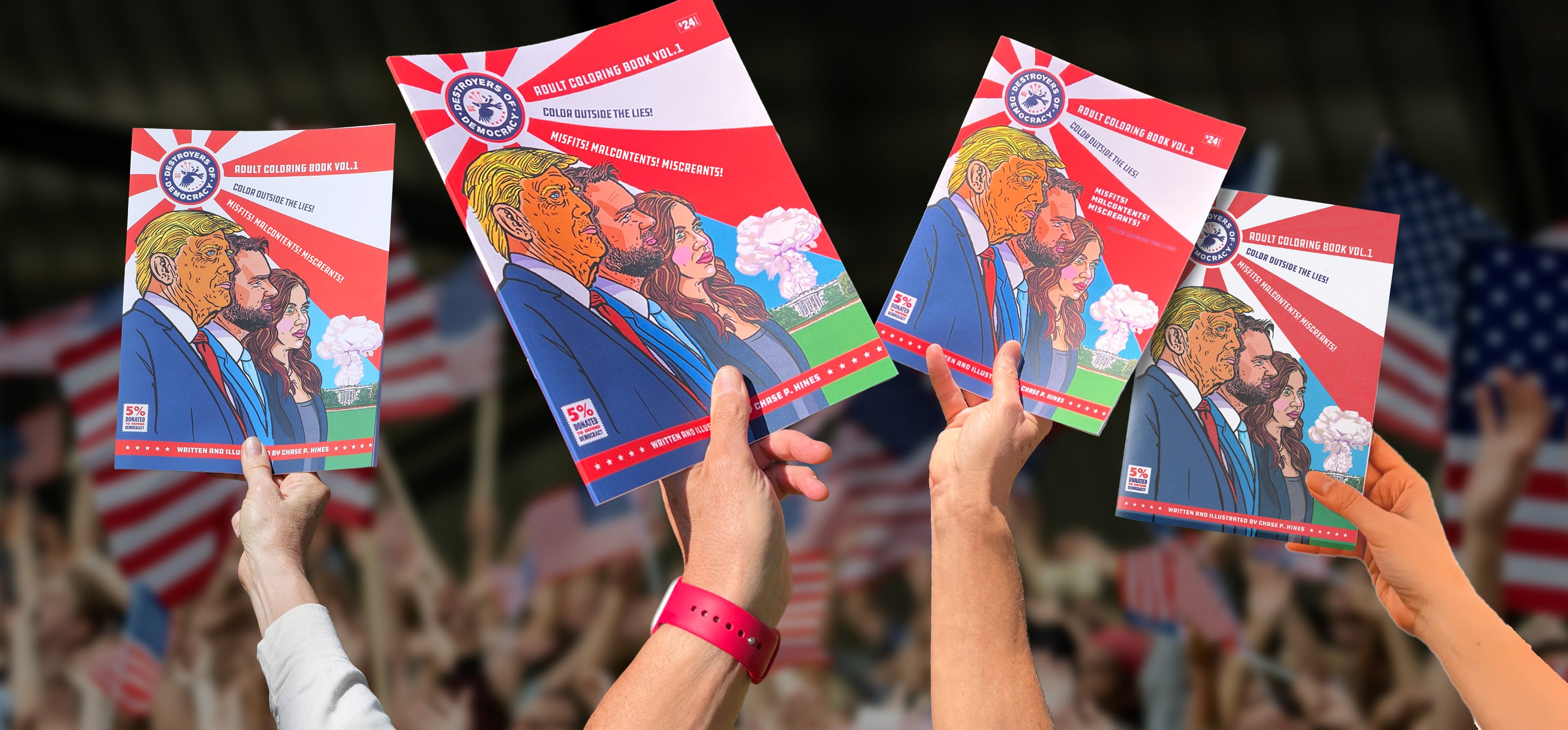 With our adult coloring book containing 24 hand drawn pages of political satire that's crazy fun, and way cheaper than therapy!