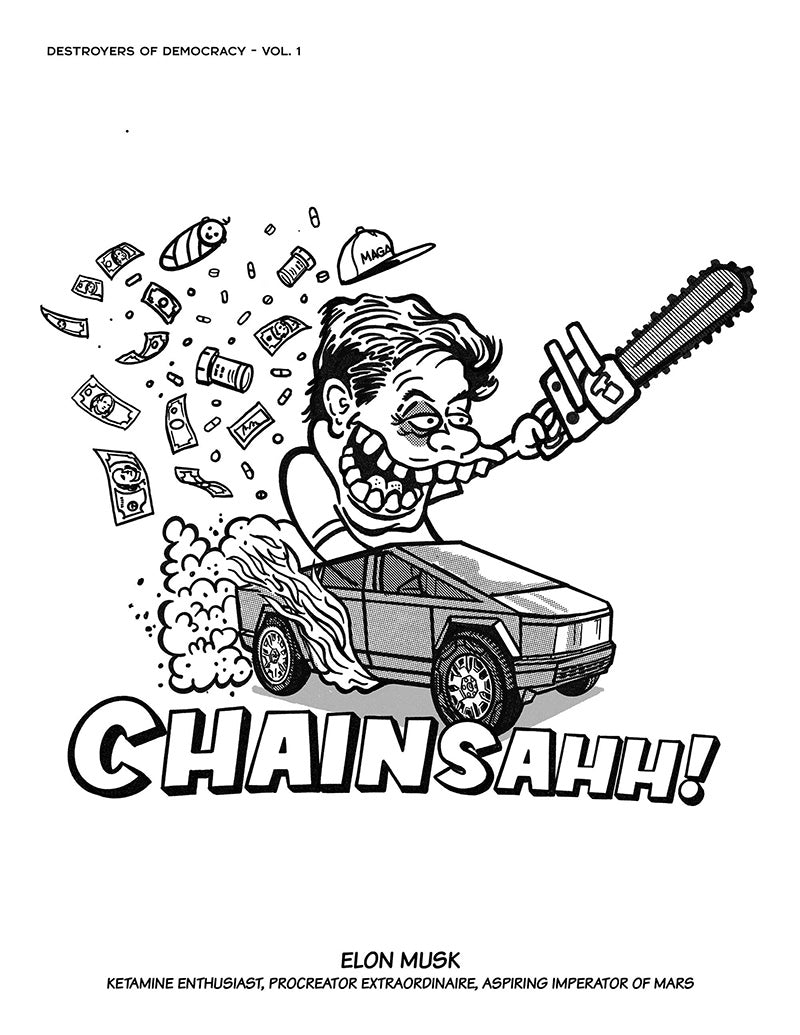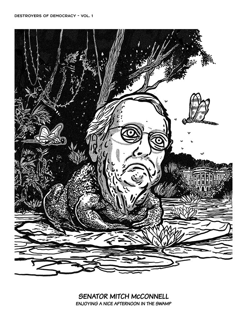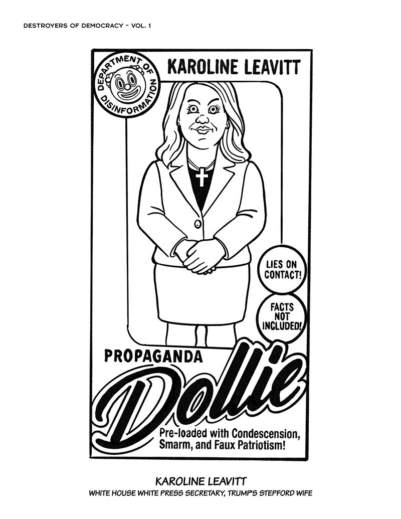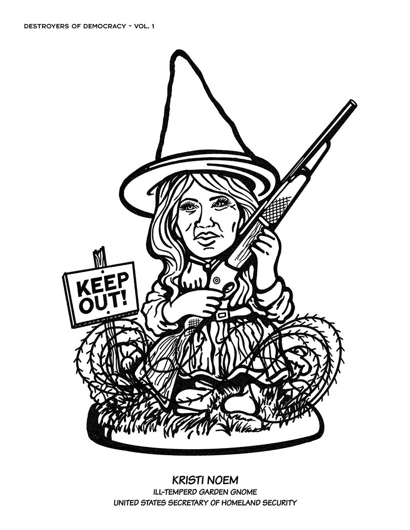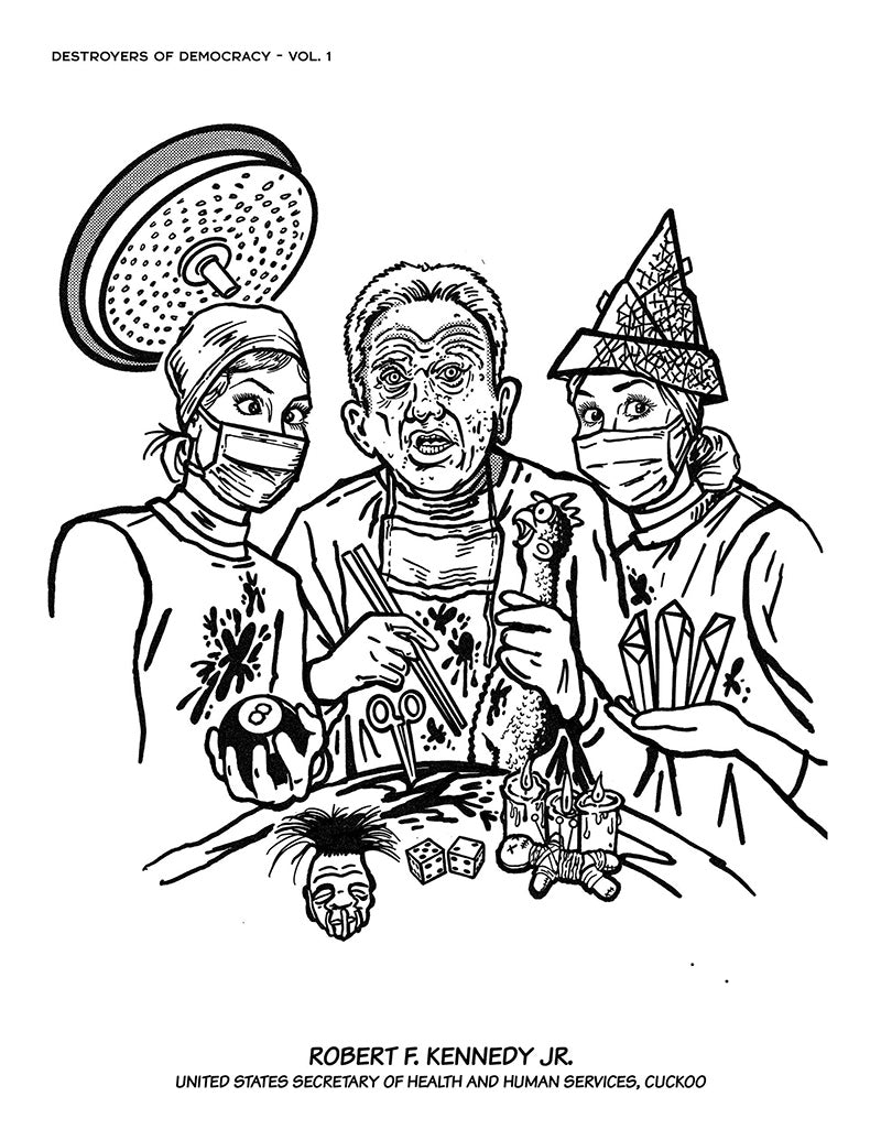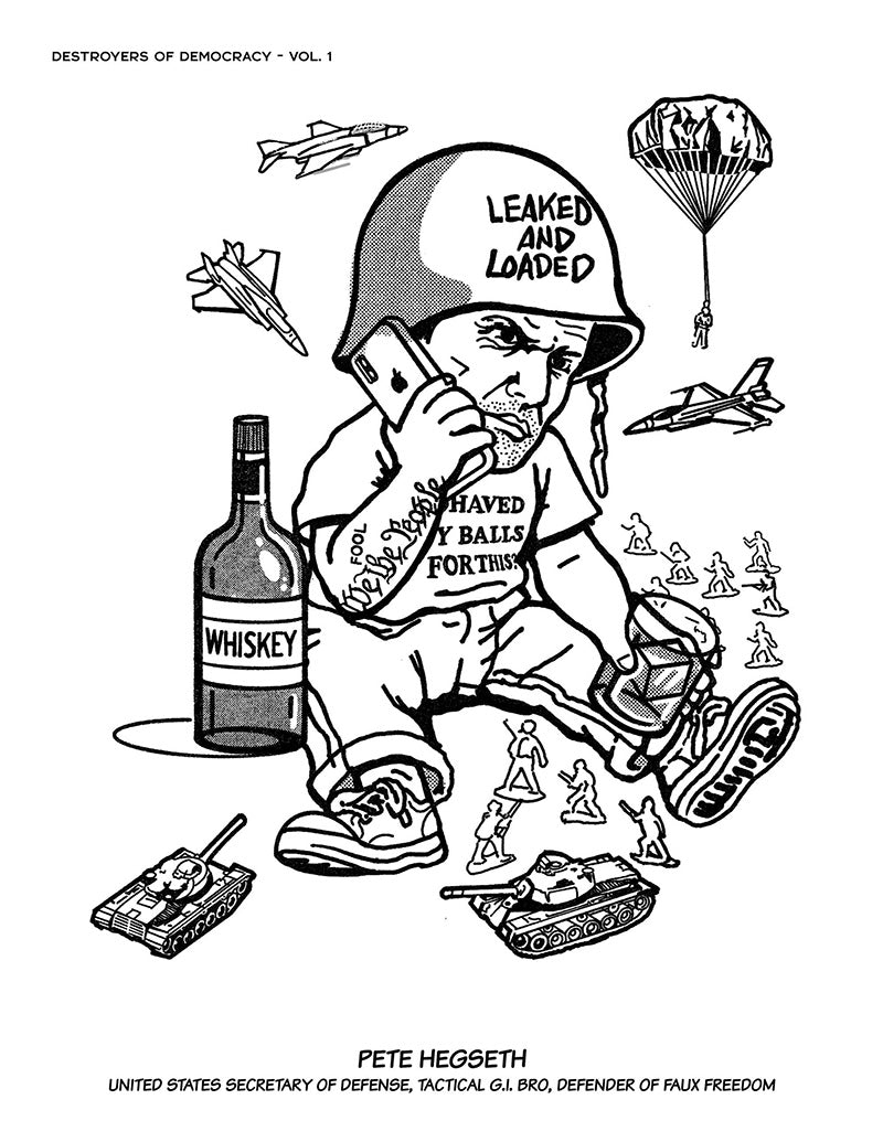 From bloated strongmen and media cronies to election-deniers and corporate sellouts, each page takes aim at the characters actively dismantling American democracy. Inspired by the irreverence of South Park, the wit of The Onion, and the raw edge of underground comix, this printable coloring book lets you rage, laugh, and reflect — one page at a time.